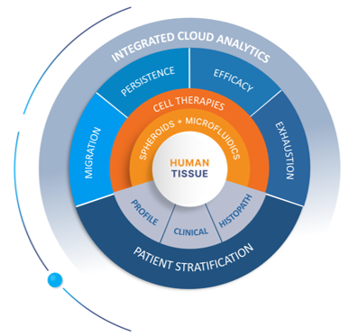 Xsphera’s human tissue platform recapitulates the complexity of each patient’s solid tumor environment and enables controlled studies to assess peripheral cell therapy migration through the ECM and subsequent tumor cell killing.